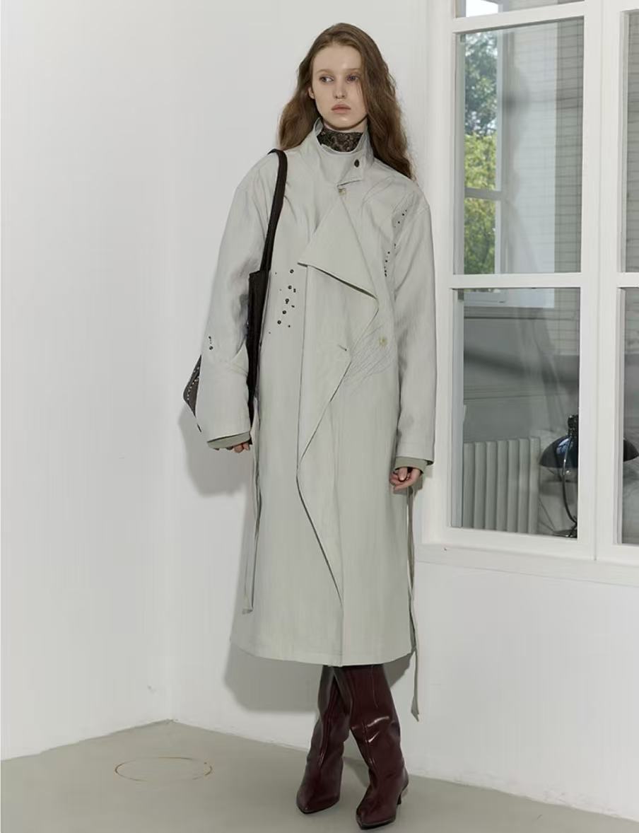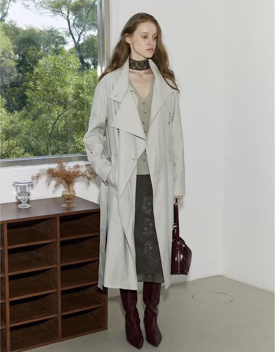 Crafted from high-density cotton-blend gabardine, the trench offers durability, wind resistance, and a smooth matte finish. The fabric is tightly woven to repel light moisture while remaining breathable. Embroidery is executed with reinforced stitching to ensure longevity, preventing fraying or distortion over time. The interior lining is silky and lightweight, allowing easy layering without friction.